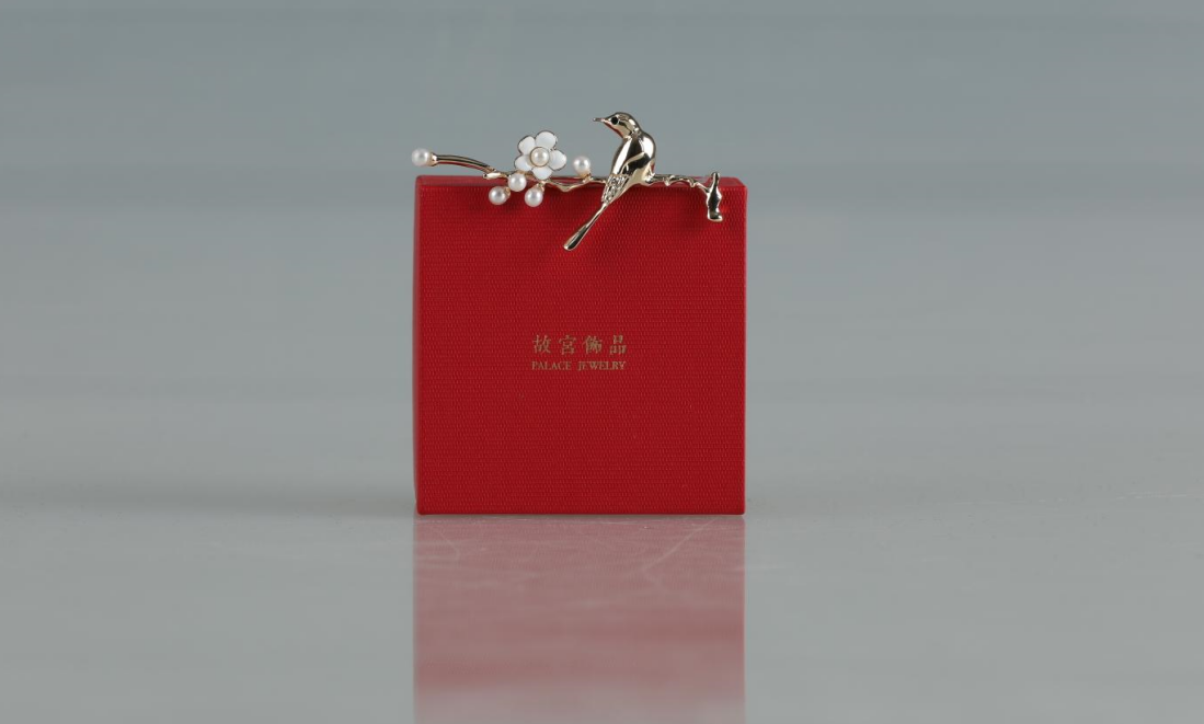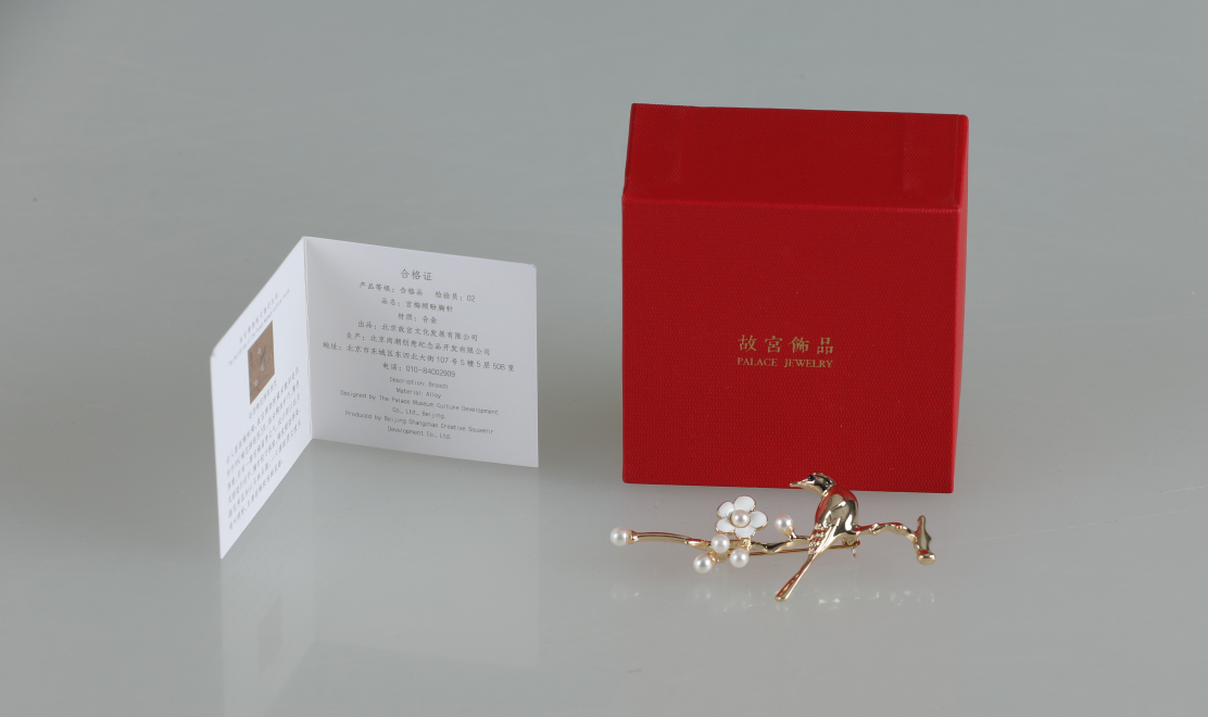 故宫文创“宫梅顾盼”胸针的设计元素源于故宫博物院馆藏文物“梅花绣眼图页”,宫梅的画法精细纤巧,敷色厚重,自有一种富贵气息。胸针取画中绣眼形象进行立体效果设计。胸针中鸟儿俏立枝头,鸣叫顾盼;梅花横斜疏影,瘦劲清丽,两者相映成趣,构成一幅美丽典雅的花鸟图。