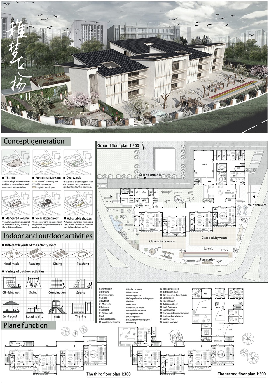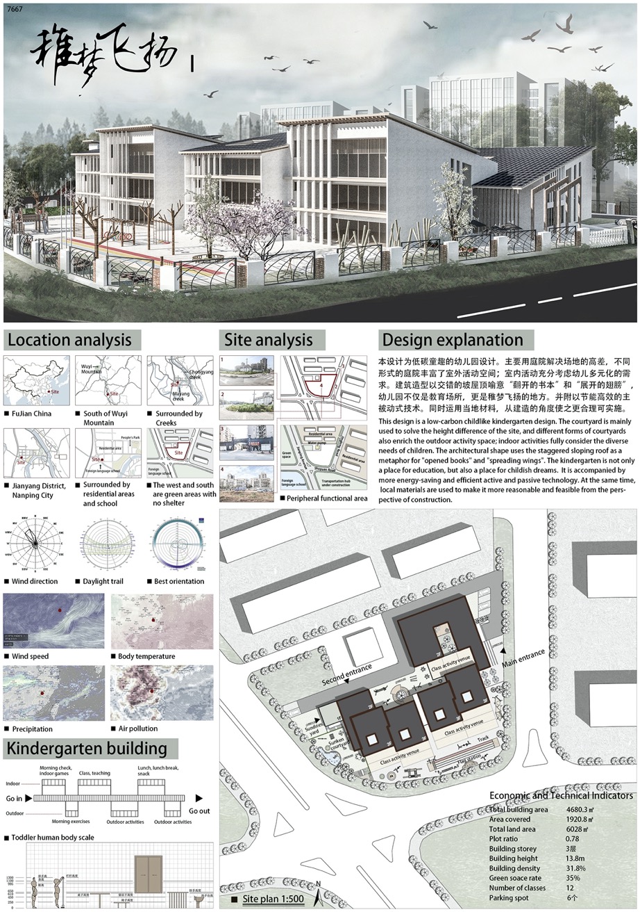 本届竞赛主题为“阳光•稚梦”,场地选择福建省南平市建阳区景龙幼儿园为赛题。主要用庭院解决场地的高差,不同形式的庭院丰富了室外活动空间;室内活动充分考虑幼儿多元化的需求。建筑造型以交错的屋顶寓意幼儿园不仅是教育场所,更是稚梦飞扬的地方。设计中附以节能高效的主被动式节能技术。同时运用当地材料,从建造的角度使之更合理可实施。