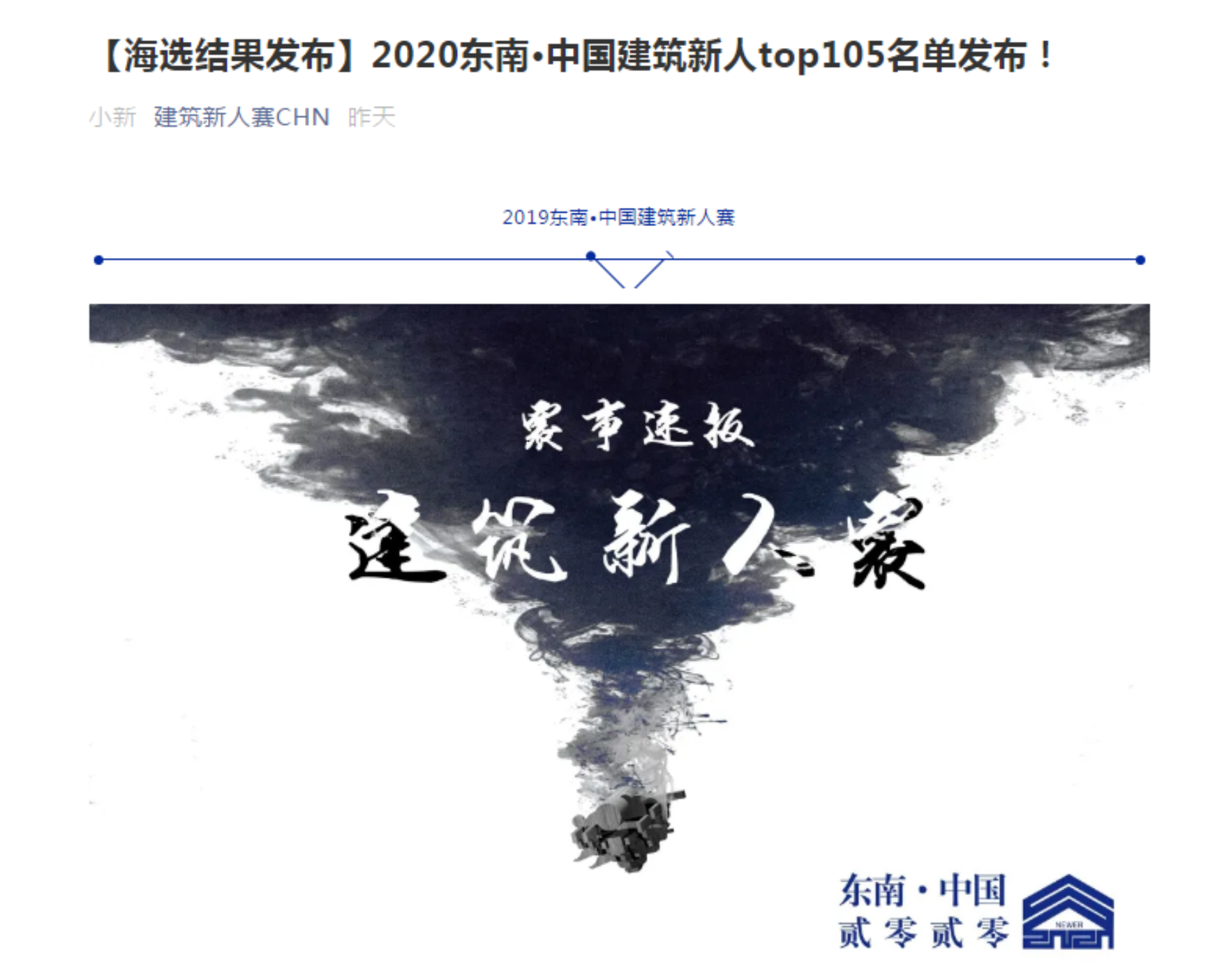 的6组设计课作品入选2020东南·中国建筑新人top105。东南·中国建筑新人赛由东南大学建筑学院主办,面向中国国内高校(建筑学院)三年级及以下在读本科生,提交作品为课程作业,交流建筑类院校教学组织和教学成果水平。