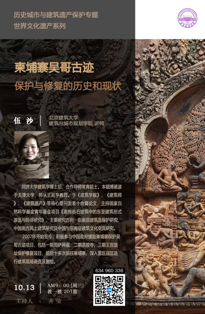 遗产保护与修复一直是建筑遗产的核心议题之一,其中柬埔寨吴哥窟作为世界文化遗产,以其庞大的规模、漫长的保护历程以及世界范围内遗产保护学者们的广泛参与,一直备受学界重视。10月13日,建筑与城市规划学院历建系的“历史城市与建筑遗产专题”课程邀请长期扎根吴哥窟保护研究团队的同济大学建筑学博士后伍沙老师,开展了一次线上线上学术讲座,听众不仅有来自建筑与城市规划学院的本、硕、博遗产方向同学,还吸引了来自线上的听众观众约200人,大家共同关注并探讨吴哥窟建筑遗产保护的成就与难点。