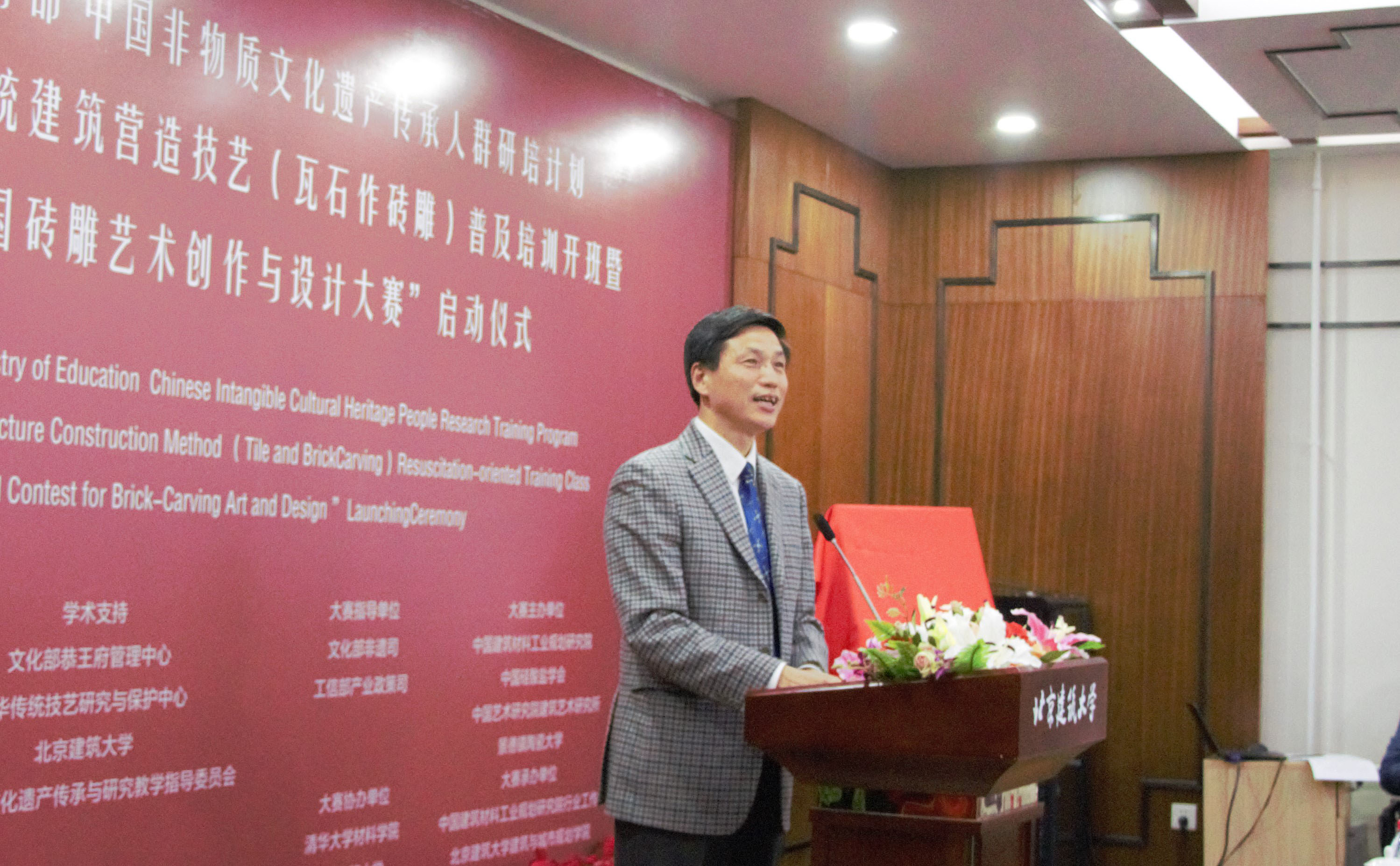 10月16日下午2点,文化部教育部中国非物质文化遗产传承人群研培计划2016年首期传统建筑营造技艺(瓦石作砖雕)普及培训班开班暨“全国砖雕艺术创作与设计大赛启动仪式”于斗地主游戏 西城校区报告厅举行。活动由副校长张大玉主持。北京建筑大学校长张爱林、工业和信息化部产业政策司副巡视员罗俊杰、文化部恭王府管理中心主任孙旭光、非物质文化遗产专家委员会副主任刘魁立、中国建筑材料联合会副会长徐永模等多位领导、专家莅临现场。张爱林、罗俊杰、孙旭光、刘魁立、徐永模分别发表致辞。表达了对非物质文化遗产保护事业未来发展的殷切期望,和对创作设计大赛圆满成功的诚挚祝愿。之后校长张爱林为孙旭光主任颁发学校发展委员顾问聘书。其后揭牌仪式与设计大赛启动仪式相继隆重举行,现场气氛十分活跃。仪式结束后,全体合影留念。
