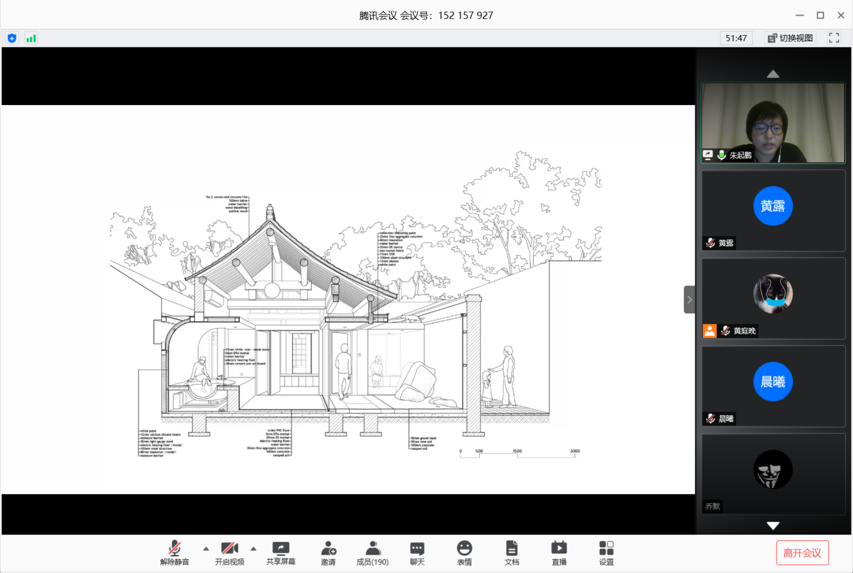 朱起鹏向线上听众分享了其若干实践作品与研究项目,讲述他倾注在每个设计中的热情、细致深入的思考、对空间的期待,以及遇到的现实困境。在自由提问阶段,同学们踊跃发言,提出关于造园传统的遗失、设计的辨识性等问题,朱老师逐一详细解答。