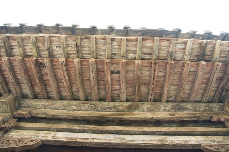 风雨侵蚀导致大木构件顺纹开裂。屋面年久失修导致椽望受潮、开裂及糟朽。
