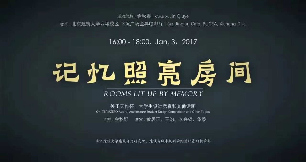 2017年1月3日16时,在北京建筑大学西城校区金点咖啡厅,由北京未来城市设计高精尖创新中心、北京建筑大学建筑学院主办,北京建筑大学建筑评论研究所、建筑学院团委承办的“记忆照亮房间”主题沙龙如期举行。此次沙龙活动由建筑学院金秋野教授策划,参会嘉宾包括:建筑学院副院长胡雪松、建筑学报主编黄居正,TAO迹建筑事务所创始人华黎,中国建筑设计研究院副总建筑师李兴钢,ADA研究中心主任王昀,北京建工建筑设计研究院副院长边志杰,同济大学出版社群岛工作室主持人秦蕾,以及学院青年教师程艳春、王韬、刘烨、丁光辉、郝石盟、黄庭晚、成慧祯等,沙龙由金秋野教授主持。沙龙现场大咖云集,各位主讲嘉宾均担任过各类设计竞赛的组织者、出题人或评委,此次沙龙主要以设计竞赛为中心展开讨论,分别就“如何面对竞赛”、“竞赛在学习中扮演的角色”、“竞赛与课程设计的关系”、“如何参与竞赛”、“一份好的竞赛作品是怎样的”、“竞赛所要传达的价值观”等议题展开讨论,旨在使同学们了解竞赛目的、摆正参赛心态,以及找准切入方向。