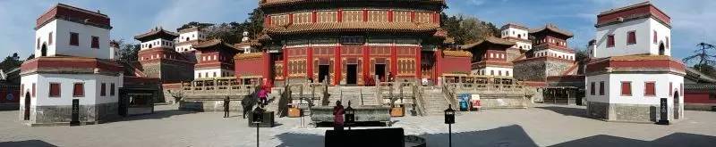 避暑山庄的建筑偏向朴素,在色彩上不如普宁寺来的艳丽,环境更为清幽,建筑最高也就两层,且建筑群处在同一个平面上。普宁寺的建筑则是建在山上,层层递进增高。建筑层数也在两层或两层以上,大殿里更是有一尊巨大的千手千眼观世音菩萨,相当壮观。建筑周围更是有不少转经筒,供信徒和游人祈福。