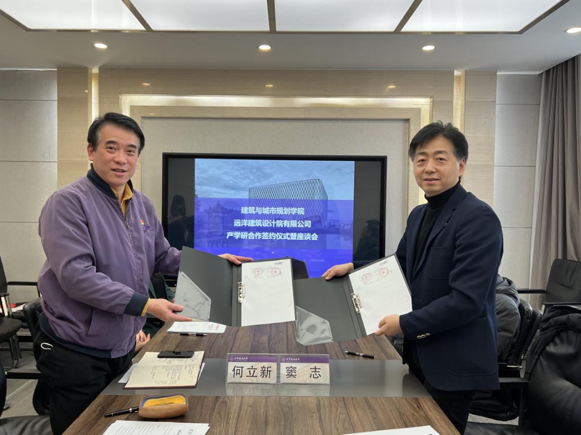建筑学院与远洋建筑设计院有限公司达成初步合作意向,窦志和何立新分别代表双方签署产学研合作框架协议书。