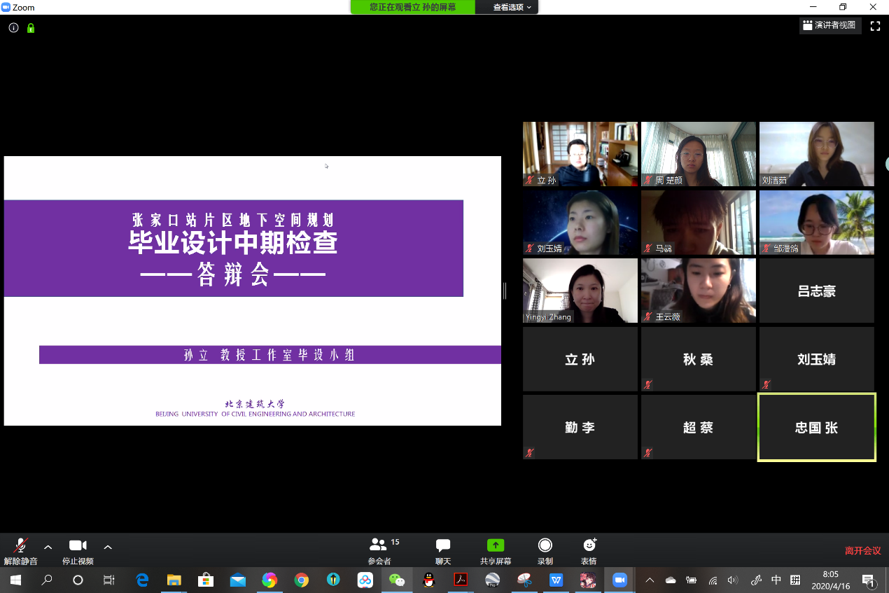 4月16日上午,2020年城乡规划专业张家口站地下空间毕业设计小组举行在线中期答辩会。中期由张忠国教授主持,评委老师包括孙立老师、李勤老师、桑秋老师和蔡超老师,该毕设小组学生共7人。