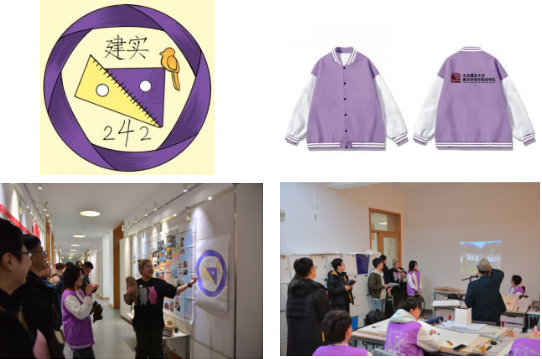 建实242班的主题是帅獭王国,帅獭是班级班长的代号。班徽,紫黄配色是两种卡套的颜色,六边形的轮廓代表我们都希望成为六边形战士,鸟一个是因为学校有很多鸟,也代表同学们展翅飞翔。我们班是一个充满活力与激情的集体,展示墙上面是每一个同学的生活照和自己家乡的建筑照片,用丝带牵到了同一个地方——北建大,我们在这里相遇相识。“学海无涯乐作舟”是我们班班训,虽然我们学习设计任务很重,经常要通宵做模型,但是我们会在专教唱歌聊天,在一种放松的状态下学习生活,保持乐观开朗的态度。