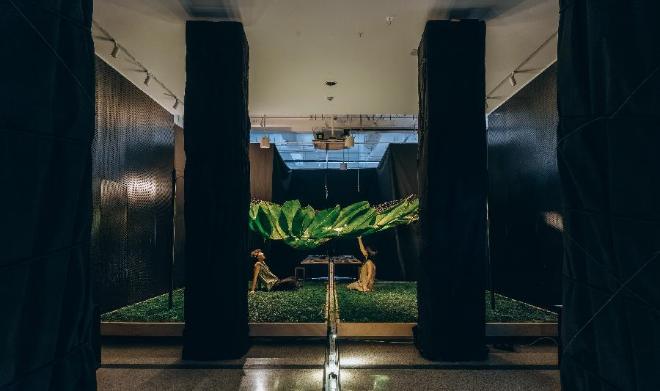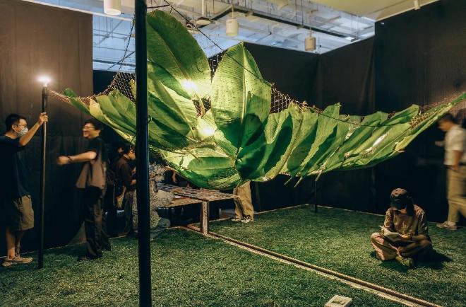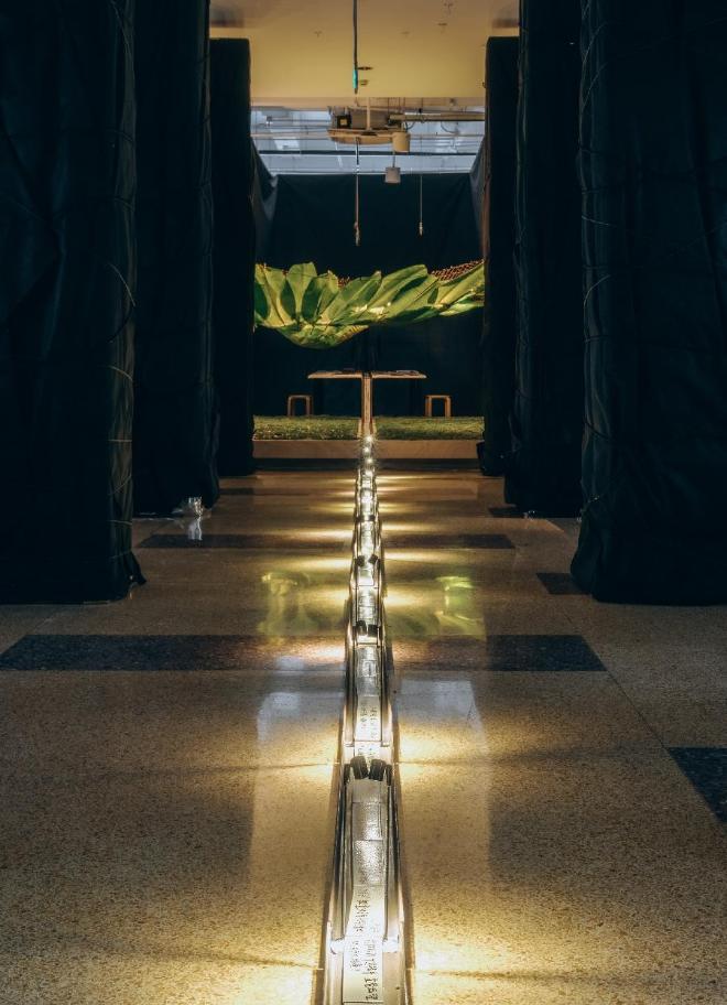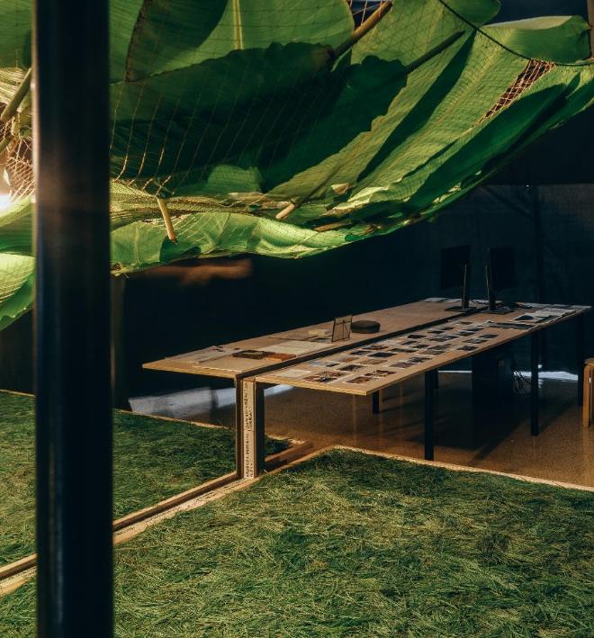 整个展览空间被一条“问题的河流”贯穿。“问题的河流”从工作桌开始穿过一个“辩经台”,最终流向远方。“辩经台”的上方是芭蕉叶,这有着“园居生活,蕉下对弈”的隐喻。“辩经台”的地面被天然松针铺满,如松针铺地的古寺。芭蕉叶和松针随着时间变化,这给整个展览空间带来退化的时间性。这个“辩经台”引导人们席地而坐,讨论问题。这里也可以成为剧场的舞台。“河流”两侧的显示屏展示着两家事务所的项目介绍。