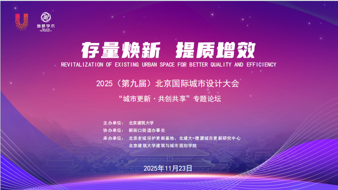 2025年11月23号,2025(第九届)北京国际城市设计大会“城市更新·共创共享”专题论坛于国际商会大厦举办。本次论坛由北京建筑大学主办,新街口街道办事处协办,北京老城保护更新基地、北建大德源城市更新研究中心、北京建筑大学斗地主游戏-单机斗地主下载 承办。汇聚建筑设计、城市规划、生态修复、历史城市保护更新等领域的专家学者与行业骨干,共探城市存量空间活化的创新方向,为学院相关学科师生搭建了优质的学术交流平台。