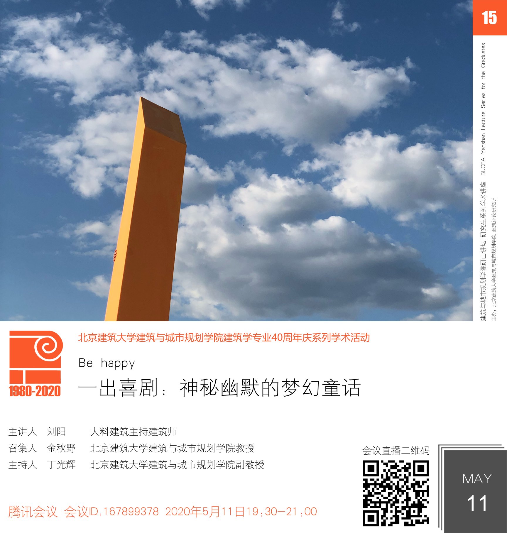“研山讲坛”创办于2019年9月,是建筑学院以研究生交流为目的的系列学术活动,活动由建筑学院常务副院长金秋野教授召集。学术活动主要采取讲座、交流形式,邀请国内外知名建筑学者和一线建筑师,分享研究成果、实践作品以及设计思想,促进在校研究生开阔视野、树立职业目标,搭建具有北京建筑大学特色的研究生学术交流平台。2020年是北京建筑大学建筑学专业创办40周年,“研山讲坛”作为“40周年庆系列学术活动”的重要内容之一,也将不断探索完善,发挥其学术号召力。