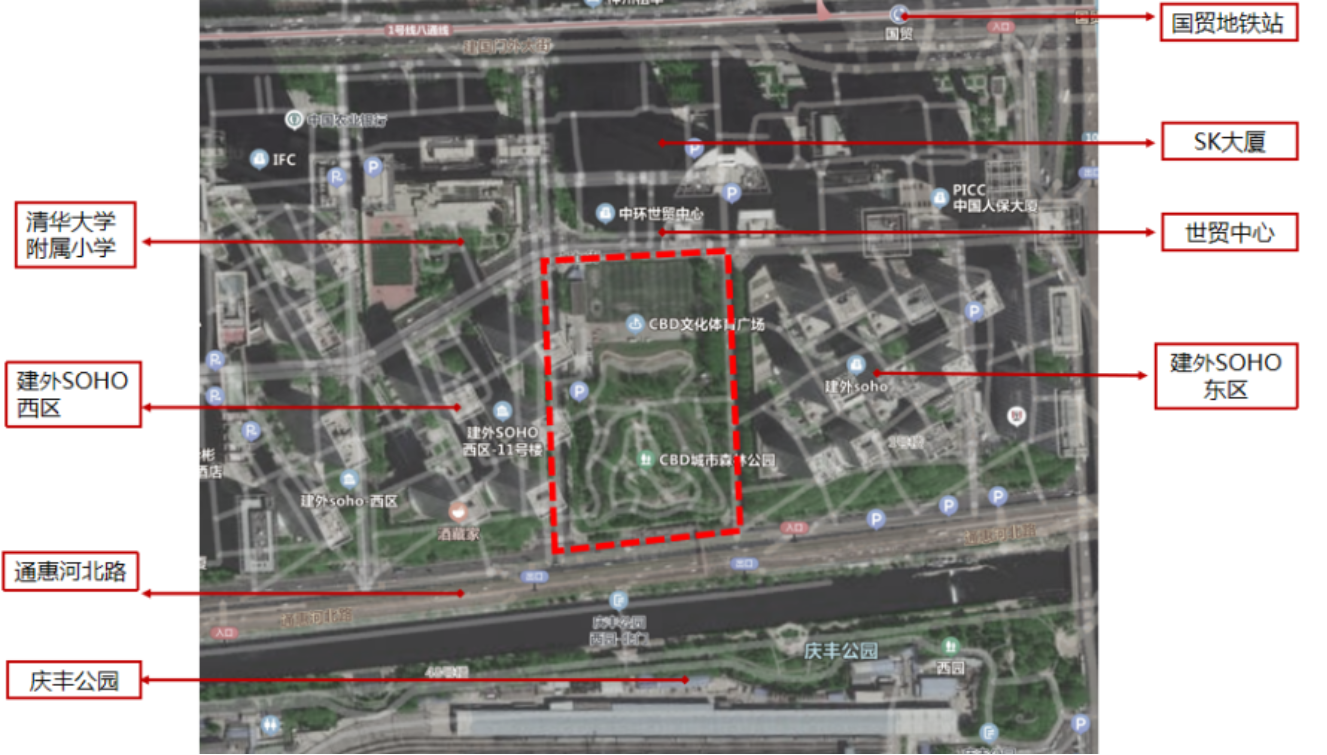 设计场地位于北京东三环国贸商圈内部,距离国贸地铁站约500米。场地南部紧邻北京大运河(朝阳通惠河段),与庆丰公园隔河相望。场地东西两侧为建外SOHO建筑群,北部毗邻SK大厦、世贸中心等商业建筑。场地四周的城市道路等级不一:东西两侧分别为恒惠东路和恒惠路(均为双车道,宽度6米);北侧为景恒街(4车道,宽度12米);南侧为通惠河北路及其辅路(宽度40米)。设计范围东西长约150米,南北长约250米,总面积约为3.75公顷。以下为学生作品。