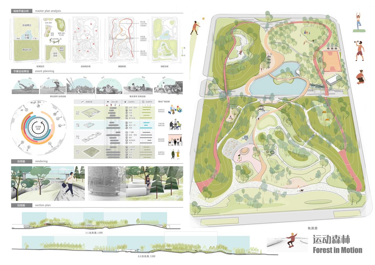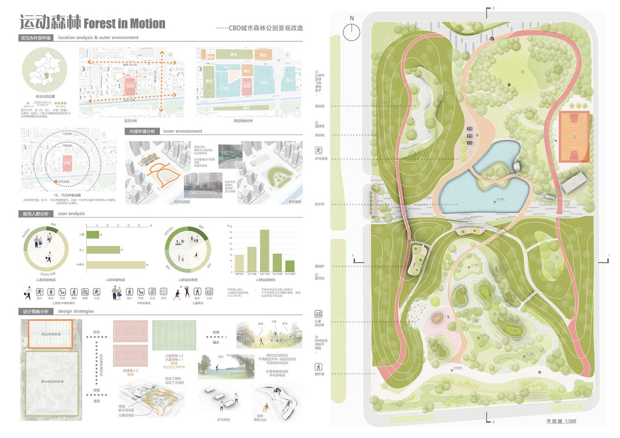 作品简介:通过对周边10/15分钟健身圈的分析,结合“全民健身”的倡议,进而分析了场地外部人群对运动的需求和对运动设施使用状况,设计出以运动为主题的公园。