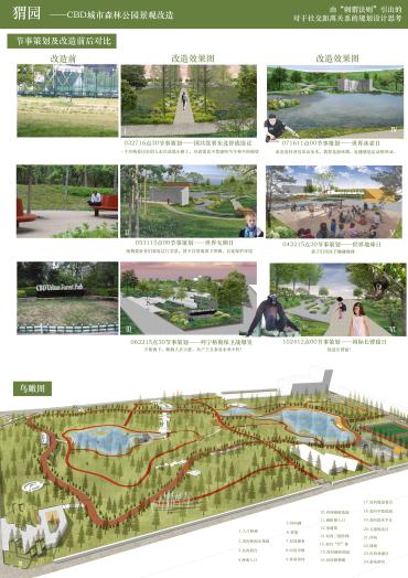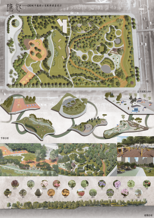作品简介:本次设计位于北京CBD内,旨在为周边白领和居民打造一个可互动的休闲娱乐空间。场地以“隐”为主题,南北两片分区分别诠释“小隐隐于野”、“大隐隐于市”。南部场地以自然式为主,借助地形为游人提供遮蔽,提高私密性和安全感;北部场地增加硬质铺装占比,设置开放性运动交流场地,增加人与人的互动。本方案在原有地形基础上,对场地进行更新改造,提高场地开放性,旨在为周边白领和居民打造一个互动休闲娱乐空间。提供更多活动空间,提高场地开放性。