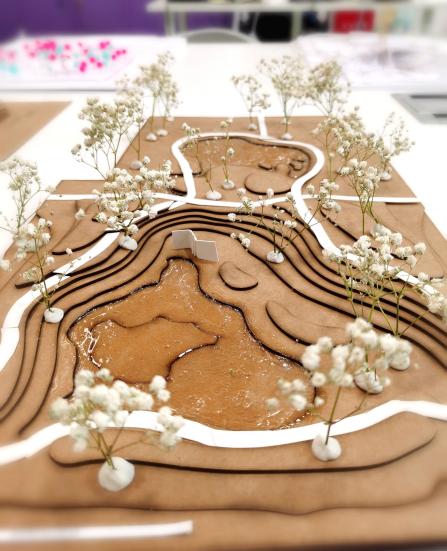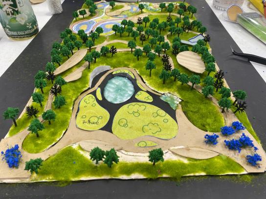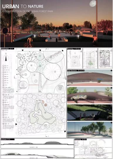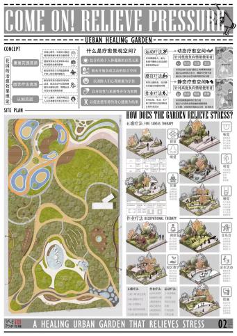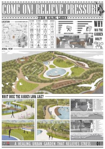 作品简介:从“为什么建造这个公园,这个公园长什么样,这个公园怎样缓解人们的压力”三个方面入手进行方案的展示。园内南侧的主要道路顺应原本的地形高差未做较大变动,通过相关理论将整个公园分为北侧的动态疗愈空间(运动疗法),主要针对低度负向情绪使用者(忧伤、失落、消沉),以及南侧的静态疗愈空间(感官疗法和作业疗法),主要针对高度负向情绪使用者(焦虑、慌张、悲愤)。在设计中主要通过三种疗法进行压力的缓解。