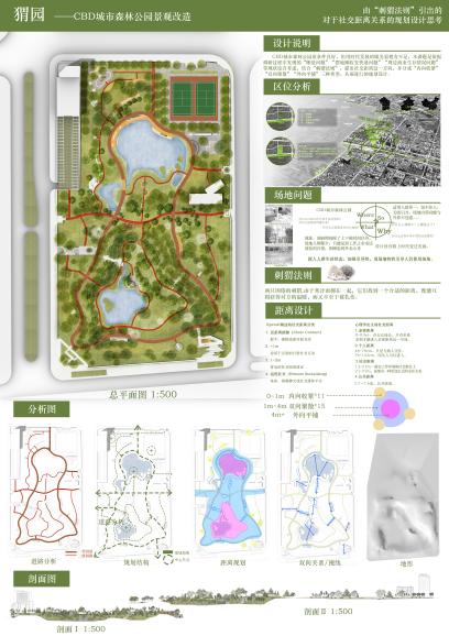 作品简介:从前期调研发现的问题中产生了对于社交距离的思考,并结合刺猬法则进行的CBD城市森林公园景观改造设计,将距离和人与人间的关系设计为“内向收紧”、“双向聚散”、“外向平铺”三个层次,将其成规律排布。