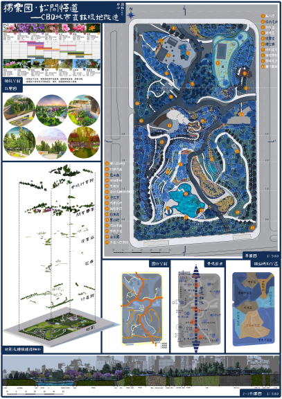 专家点评:方案主题鲜明,完成度较高。注意设计应针对周边使用人群,根据前期调研分析设置场地及其功能性,多考虑场地的“边界”。场地中部分功能杂糅,中心场地不够突出,小场地划分较为均质化。图纸表达清晰完整,能够表达方案内容及特点。整体性有待提高,应在场地中适当留白,在小场地中也保持主题的风格特点。
