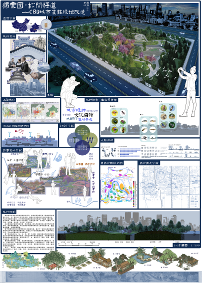 作品简介:选取中国画《独乐园》作为骨架,将其中的八景融入设计里面。本次景观设计题目为叫独乐园·松间悟道,是因为考虑到原植物配置带来的沉心静气氛围,达到“在松林中悟道,于楼宇间独乐”的境界。通过构造自然的地形起伏设计水景和种植各类树木花草,,种植选择具有地方特色的植物,如紫薇、丁香、合欢等。在增加方案整体在提高场地绿地面积的同时,使得入口、水景、林间节点、阶梯舞台、景墙、南侧水体在一条景观轴线上,呈现出四季有景的美丽景致,体现具有出中国传统文化美学的空间。