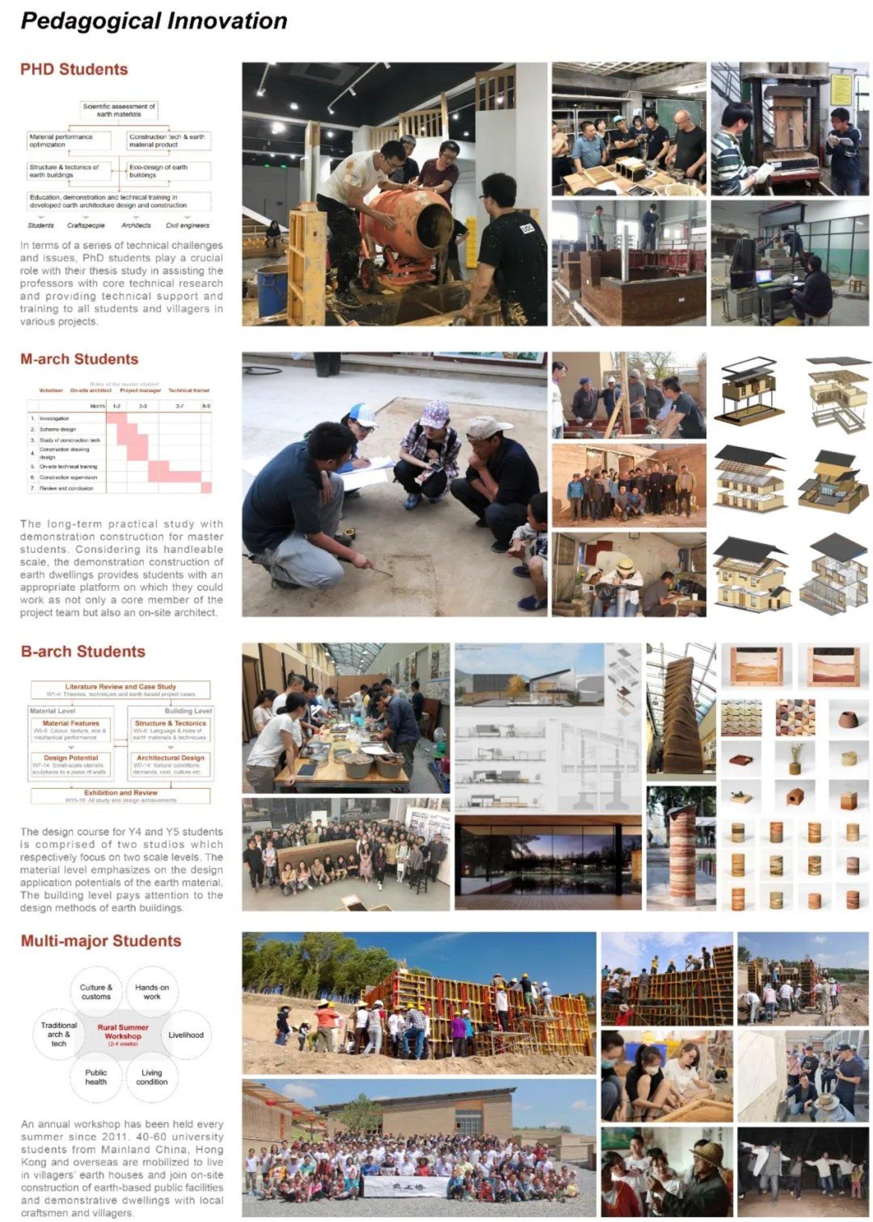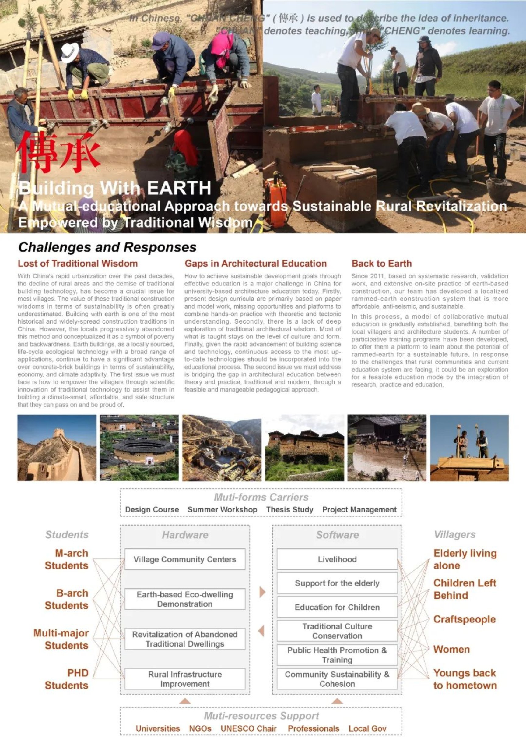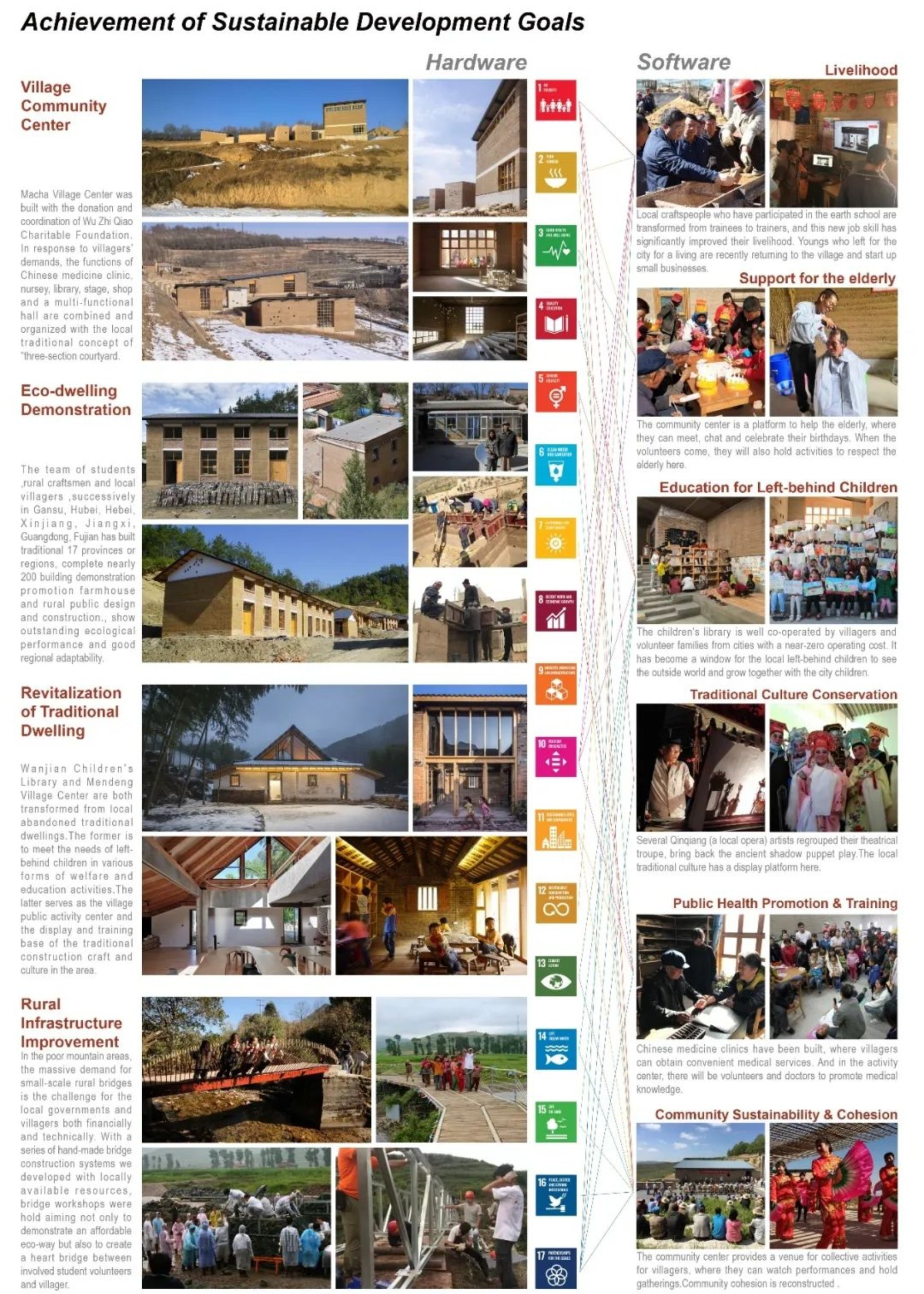 自2011年以来,在住房和城乡建设部的指导下,穆钧教授团队基于在传统营建技术革新与绿色建筑方面取得的科研成果,联合西安建筑科技大学、中国城市规划设计研究院等多个高校或科研机构师生团队,结合课程教学、暑期工作营、研究生论文、社会实践等多种教学形式,在甘肃、青海、新疆、福建、安徽、河北等17个省或地区与当地村民相互协作,一同开展绿色农房、乡村公建、基础设施以及传统民居活化改造等公益示范项目,逐渐形成了面向建筑学专业本硕博以及相关专业本科生的学研融合与多元协同教育模式,并全面契合了联合国设立的17项可持续发展目标。相关的教学和科研工作也到了无止桥慈善基金的支持。