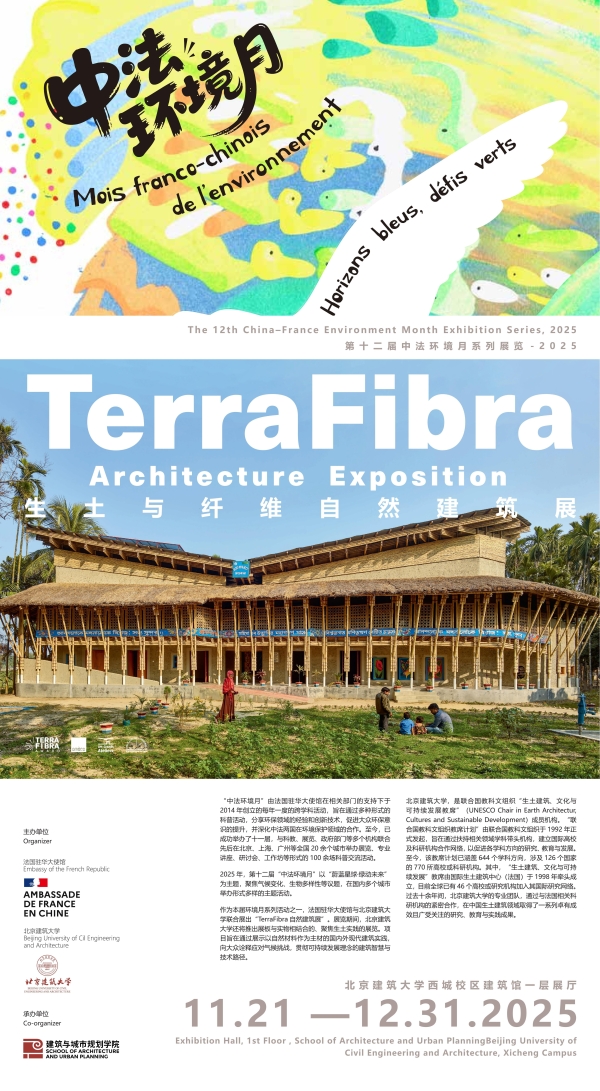 作为本届环境月系列活动之一,法国驻华大使馆与北京建筑大学联合展出“TerraFibra自然建筑展”。展览期间,北京建筑大学还将推出展板与实物相结合的、聚焦生土实践的展览。项目旨在通过展示以自然材料作为主材的国内外现代建筑实践,向大众诠释应对气候挑战,贯彻可持续发展理念的建筑智慧与技术路径。