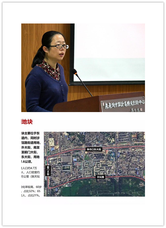 廖所介绍城市整体背景之后,石闻规划师则深入基地,讲解本次天坛北侧具体地块的情况,含上位规划、现状条件和规划历史等,资料详实、数据丰富、信息量大。
