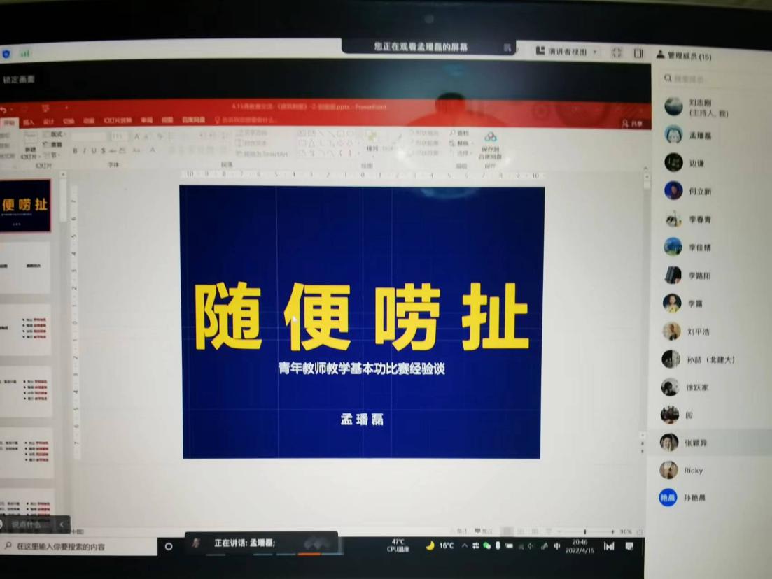 为了提高建筑学院青年教师的教学能力,建筑学院青年教师基本功比赛初赛结束后,学院于4月15日晚举办线上经验交流会,特别邀请第十三届北京市青年教师教学比赛一等奖获得者、建筑系孟璠磊副教授做了经验分享。建筑学院党委书记何立新、教学副院长李春青以及十多位青年教师参加了会议。
