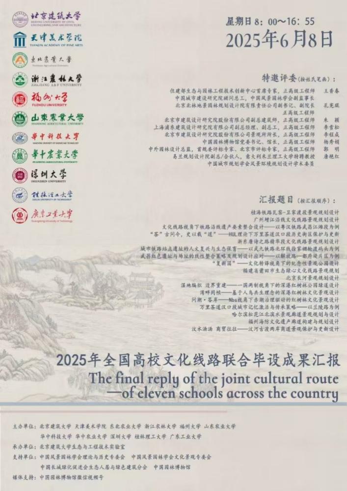 2025年6月8日,2025年全国高校文化线路联合毕业设计成果汇报会顺利举行。该活动由中国风景园林学会理论与历史专委会、中国风景园林学会文化景观专委会、中国长城绿化促进会生态人居与绿色建筑分会、中国园林博物馆支持,北京建筑大学、天津美术学院、东北林业大学、浙江农林大学、福州大学、山东农业大学、华中科技大学、华中农林大学、深圳大学、桂林理工大学、广东工业大学等11所高校联合主办,北京建筑大学风景园林生态与工程技术实验室承办,中国园林博物馆视频号全程进行直播。