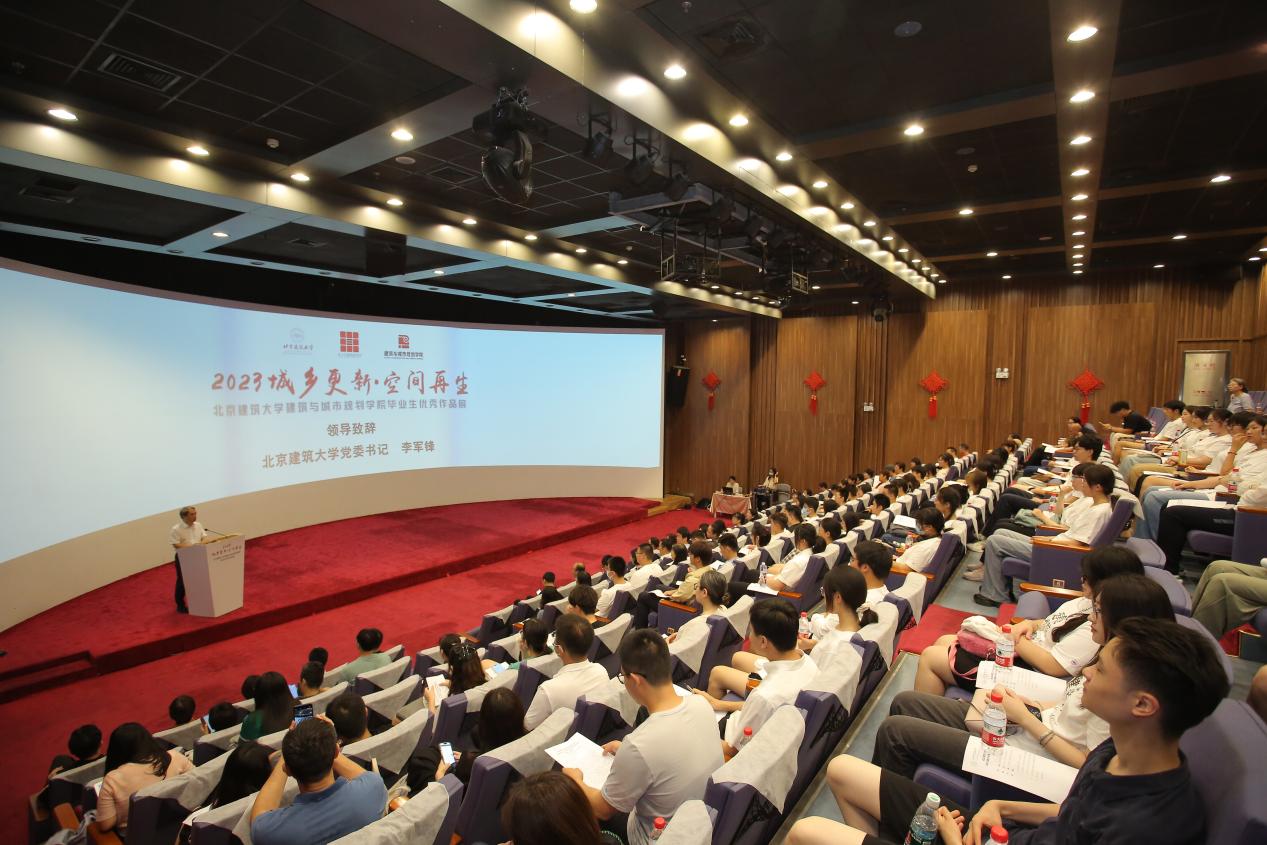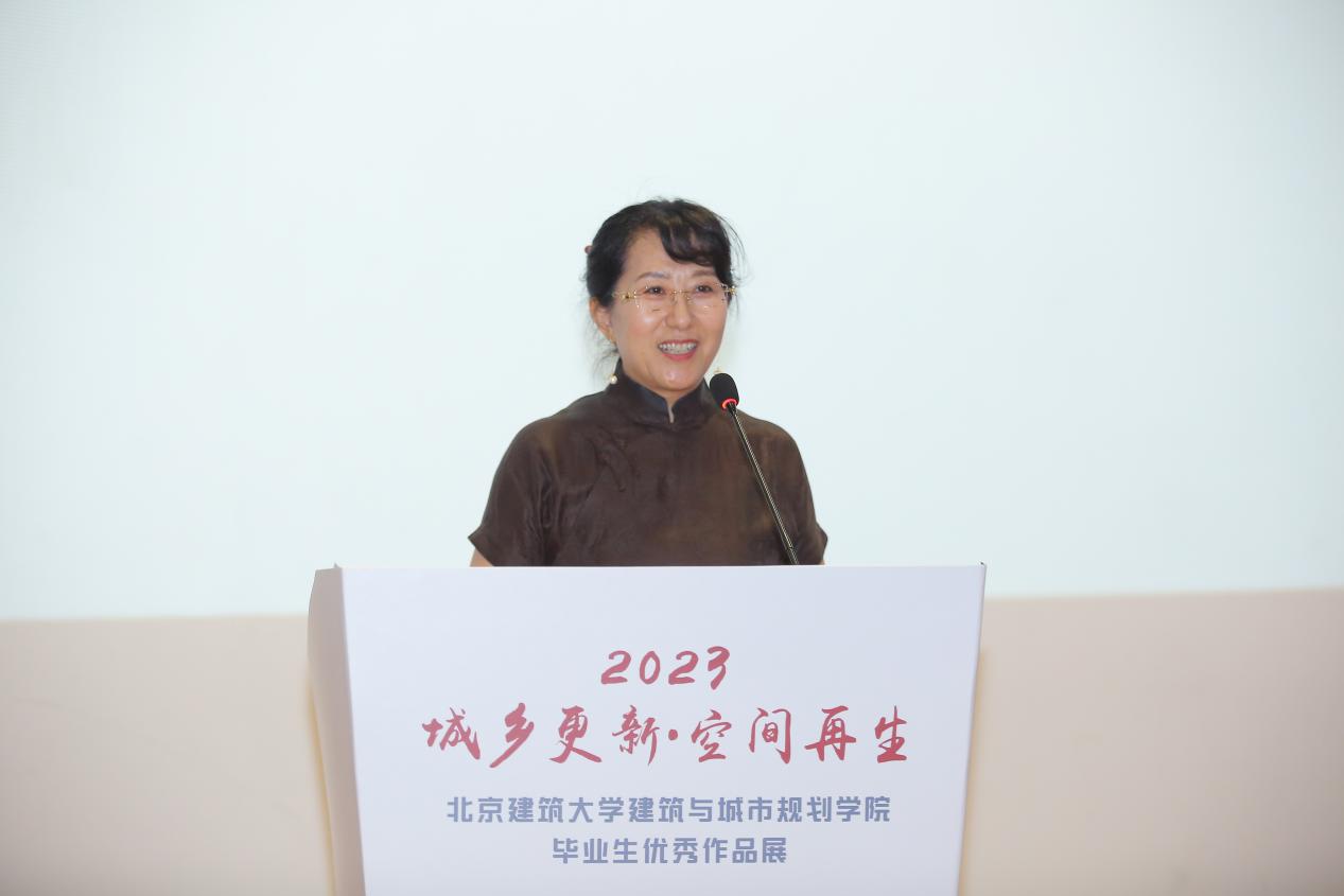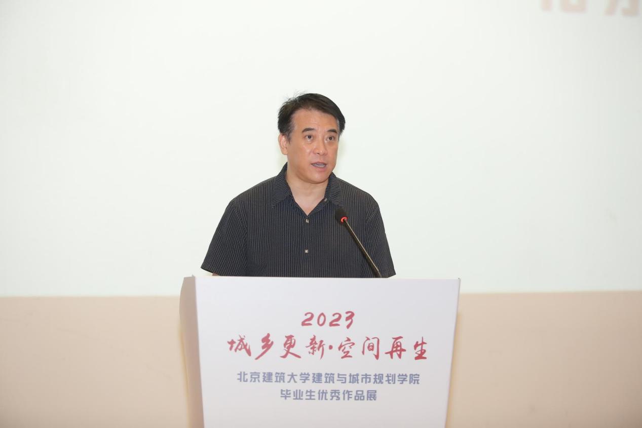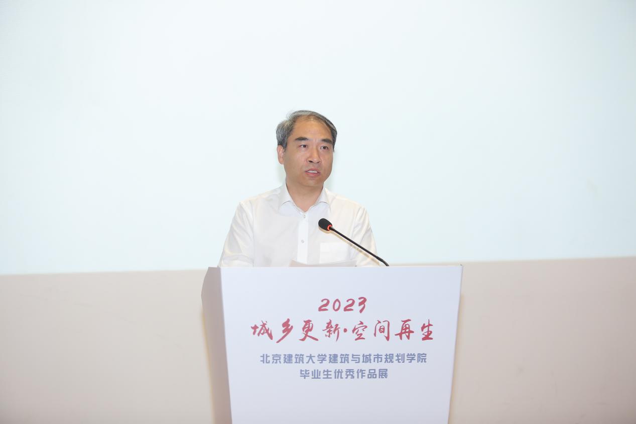 北京建筑大学党委书记李军锋为开幕式致辞。他讲到,作为一所具有百年校史的高水平特色型大学,北建大始终与时代发展同频共振、与首都城乡建设同向同行。“坚持人民城市人民建、人民城市为人民”“实施城市更新行动”是党的二十大作出的重要战略部署。本次毕业生优秀作品展以“城乡更新·空间再生”为主题,以专业所长服务城市更新,为人民城市建设贡献建大力量。希望毕业生们不忘初心,运用所学知识继续为服务人民城市建设、服务中国式现代化作出更大贡献,也希望2023级本科新生同学以优秀毕业生为榜样,在学校勤奋学习,勇于追梦,努力成长为未来的“规划师、设计师、建筑师”人才!
