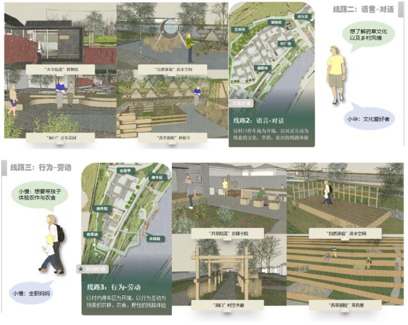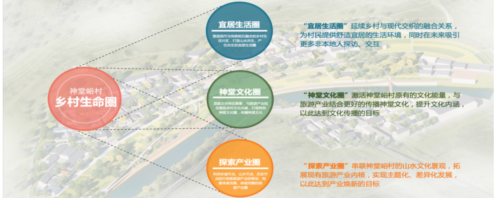 设计从神堂峪村的三个自身价值,即旅游价值、药草文化价值、生活康养价值入手,通过揭示各个价值所对应的发展潜力点,提出“以生态为底、以文化为核、以探索为题,构建乡村生命圈”的规划策略。其中“乡村生命圈”由宜居生活圈、神堂文化圈、探索产业圈构成,对应了生活层面,文化层面、产业层面的突破,以此调动神堂峪村未来可持续发展的动力。在村庄风貌设计上我们采用“向自然开放”的手法,将滨河公园划分为“一看一互动”两条主要路线,并与村内现有主街巷连接,东侧利用空闲地规划一处附有药草加工体验装置的阶梯景观田。中心公共空间改造一处废弃民房变身公共活动室,重新梳理村广场的公共流线,北侧规划一处探索旅游服务端,东侧规划一处生态停车场,共同组成未来核心公共服务组团。