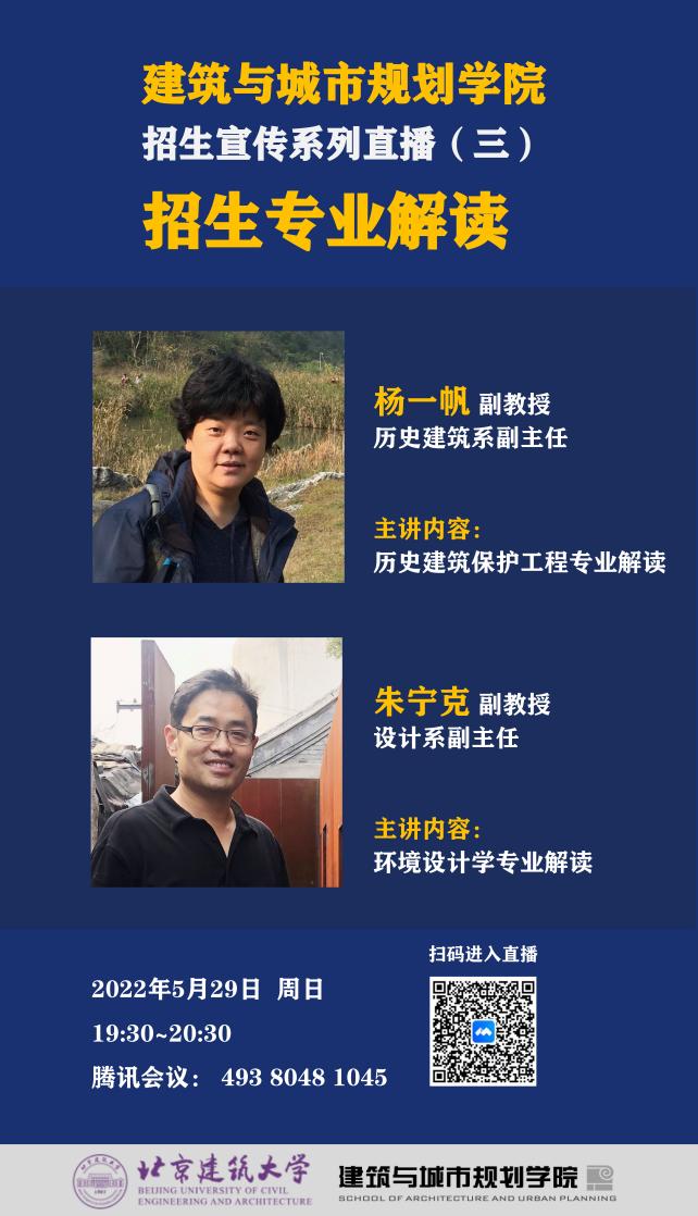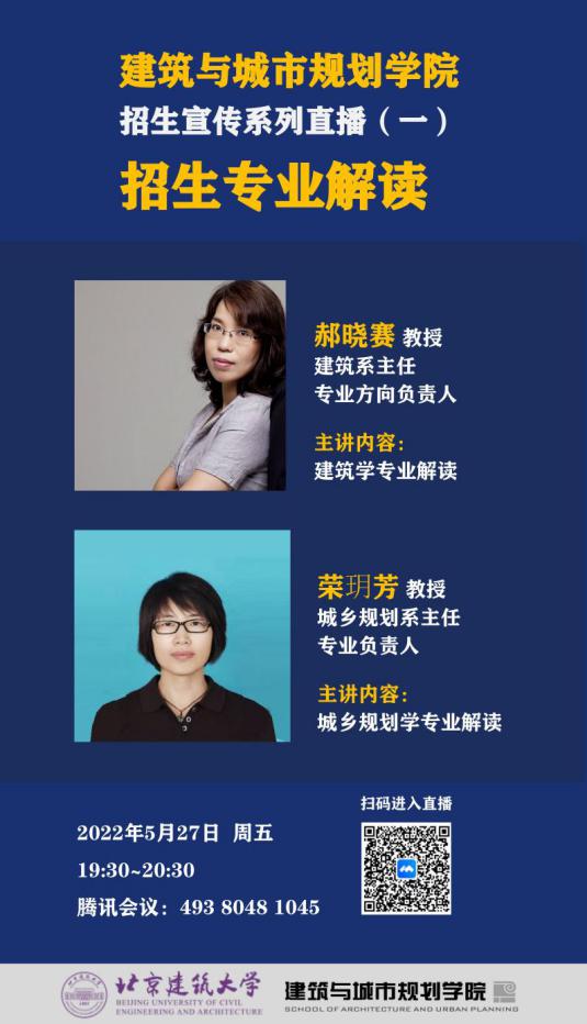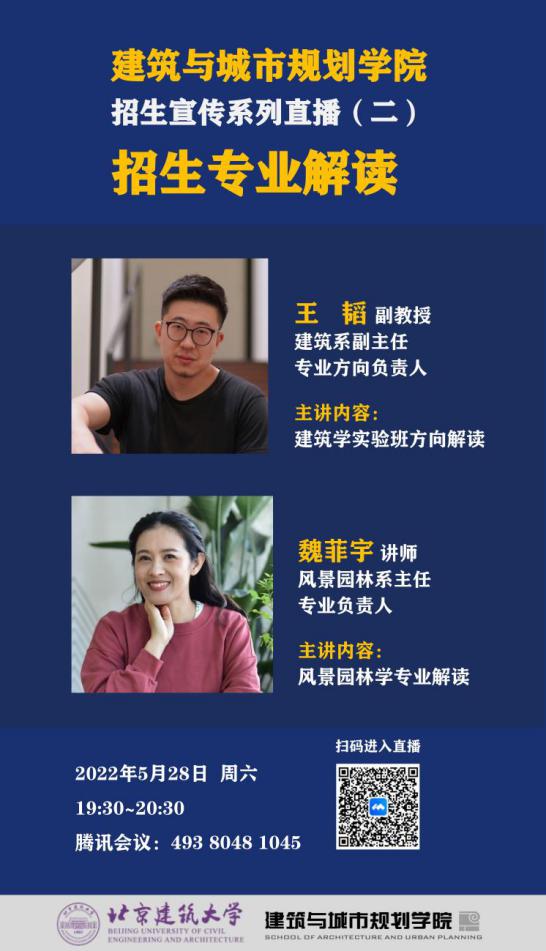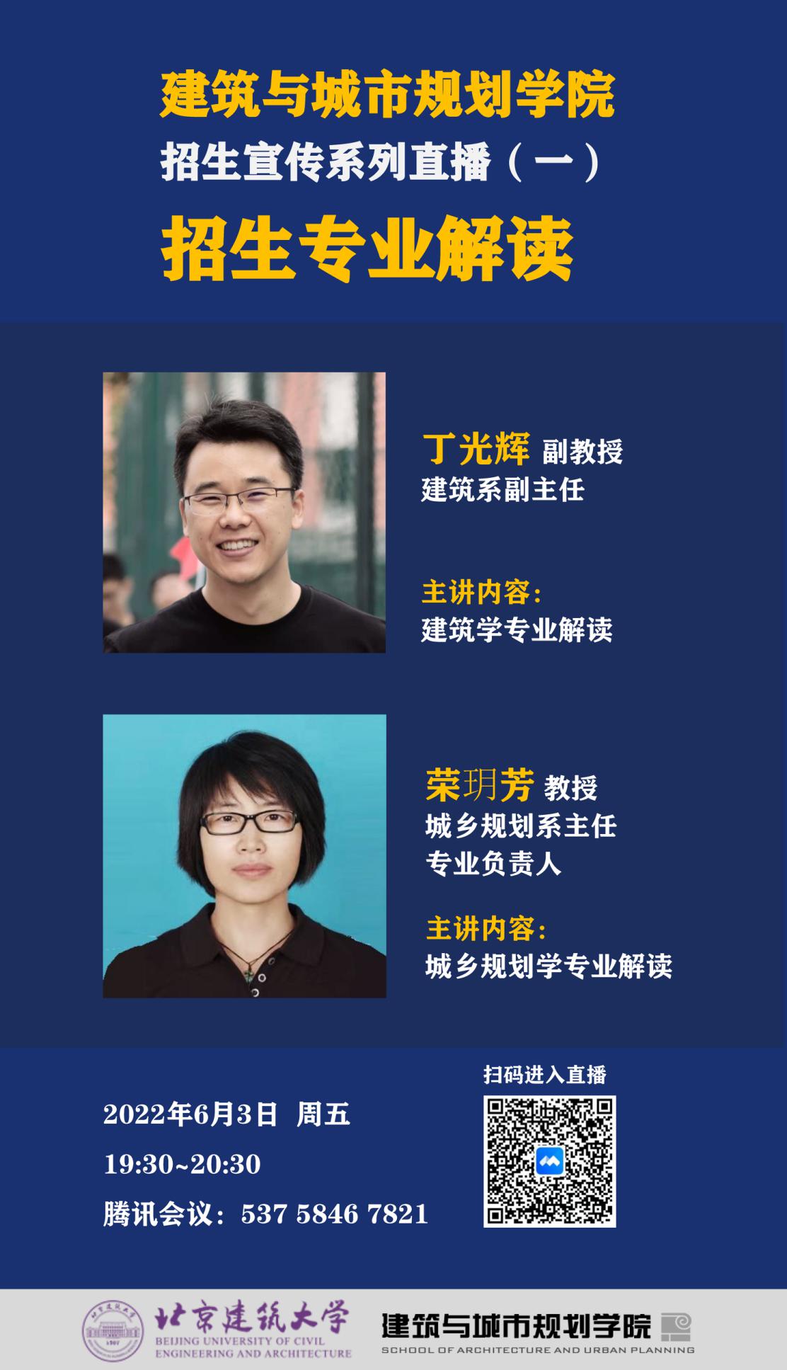 二期招生宣传直播活动将于本周末举行,希望广大考生和家长积极参与,早日考到北京建筑大学学习心仪的建筑类专业,成为首都规划建设的规划师、建筑师和设计师!