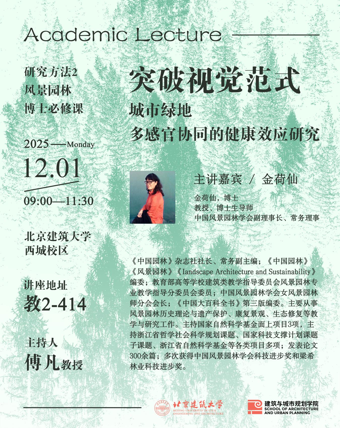 12月1日上午,《研究方法2(风景园林)》博士必修课特邀学术讲座在西城校区教2-414顺利举办,中国风景园林学会副理事长、《中国园林》杂志社社长、浙江农林大学金荷仙教授担任主讲嘉宾。讲座由风景园林系傅凡教授主持。