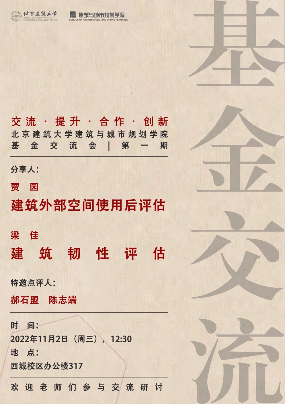 第一期“建院学术分享会”于2022年11月2日,在西城校区办公楼317会议室成功举办,建筑副院长、副教授张振威,分享人贾园、梁佳,特邀点评人郝石盟、陈志端,以及孟璠磊、徐海韵、黄庭晚、孙艳晨、王瑞琦、张琳、王珊珊等多名青年教师共同参与交流,活动由张振威主持。