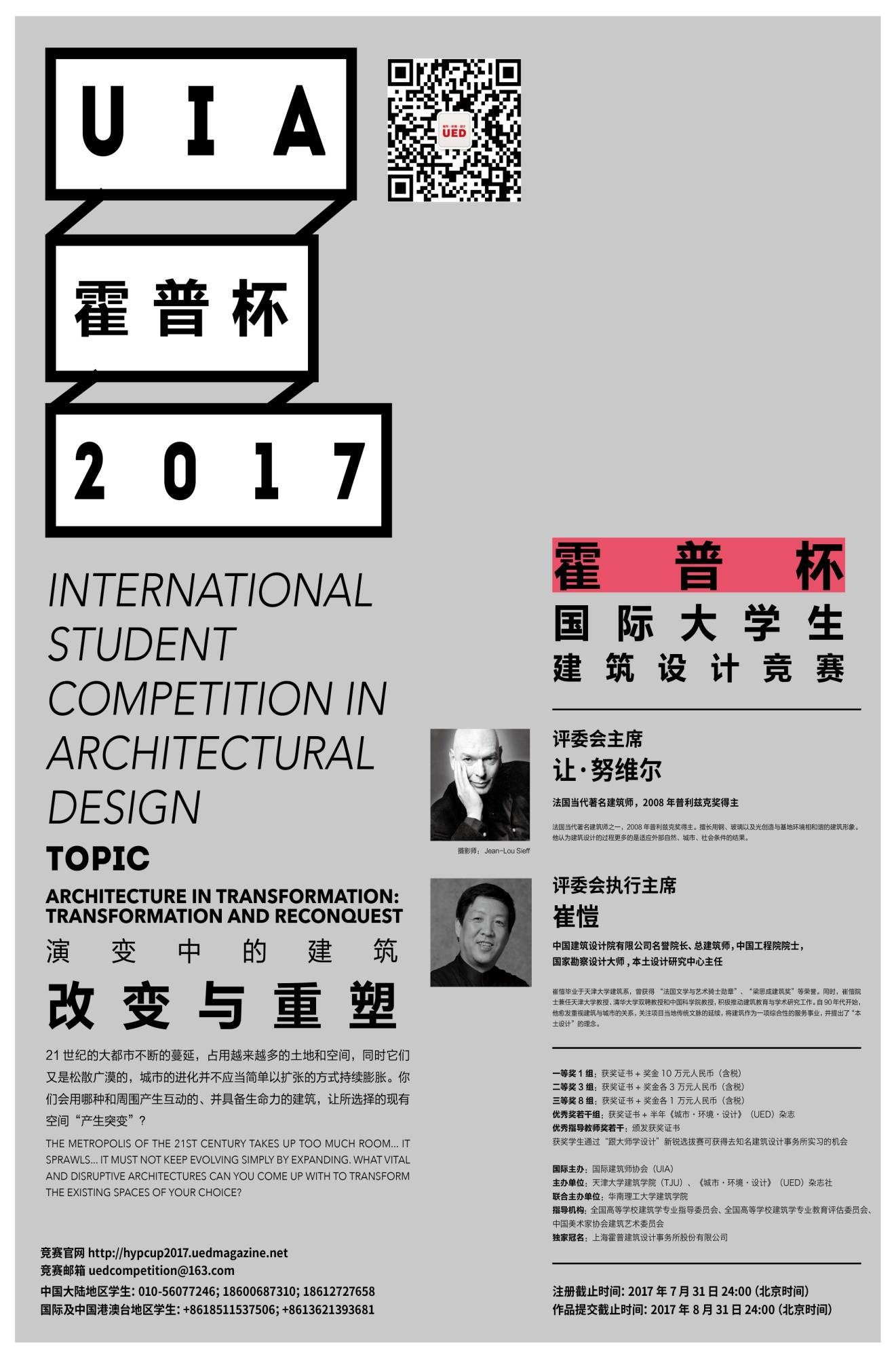 建筑进化的过程在于对现状问题的反思以及对所处时代的回应。建筑与城市、建筑与自然环境的关系问题一直是建筑师面临的课题。在支离破碎的城市、无序的乡村里寻找与构建具有场所感的人性化空间;在信息时代,体现与生态环境相协调的可持续发展的建筑理念;在建筑学教育体系中,将设计理念与扎实的建筑学功底有效地结合,是UIA-霍普杯国际大学?建筑设计竞赛秉承的主旨。竞赛要求参与者不断追问与探索建筑发展之路,探讨当代人对建筑与环境的复杂性需求,关注特定场所及其中的事件,构建具有生命?的城市与建筑空间,并寻求适宜技术使方案具有可实施性。 “UIA-霍普杯国际大学生建筑设计竞赛”始于2012年,由国际建筑师协会(UIA)任国际主办,天津大学建筑学院、《城市·环境·设计》(UED)杂志社任主办单位,是由霍普股份独家赞助的面向国际建筑高校大学生的年度建筑设计竞赛,已成功举办五届。2017年,竞赛将由华南理工大学建筑学院联合主办。每届竞赛的评委会主席由一名国际著名建筑大师担任,竞赛评委为来自国内外的著名建筑师及学院院长。经过五年的推行实践,这场由中国学术机构主办的国际大学生建筑设计竞赛已经成为最具影响力与公信力,规模最大的学生竞赛之一,在国内外建筑教育界具有广泛影响。