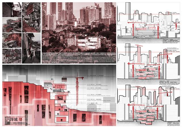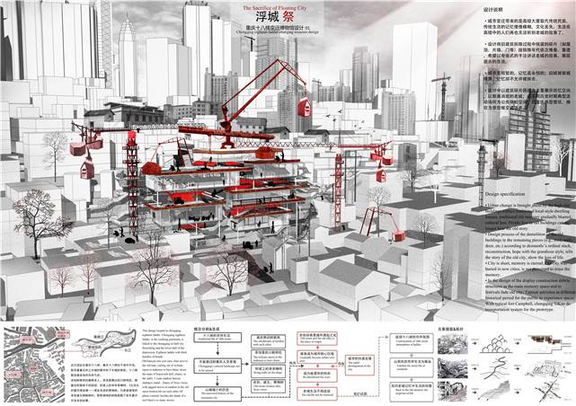 5.设计中将建筑碎片搭建为主要展示回忆空间,以祭奠消逝的老城;以不同历史时期典型活动场所为公共体验空间;以重庆典型的梯坎为原型做交通体系。