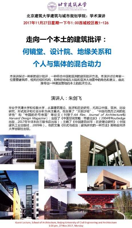 朱剑飞,毕业于天津大学和伦敦大学,从事建筑理论、批评和历史研究,尤其以中国、亚洲、比较研究、形式批评和社会分析为关注重点。他发表了“天朝沙场”、“中国与西方之间的批评性”和“帝国的符号帝国”等论文(刊登于AA files、Journal ofArchitecture和Harvard Design Magazine);出版了《中国空间策略:帝都北京》(2004年Routledge出版,2017年中译本由三联书店出版);主编了《中国建筑60年:历史理论研究》(中国建筑工业出版社,2009年)。他的文集《形式与政治:建筑研究的一种方法》即将由同济大学出版社出版。