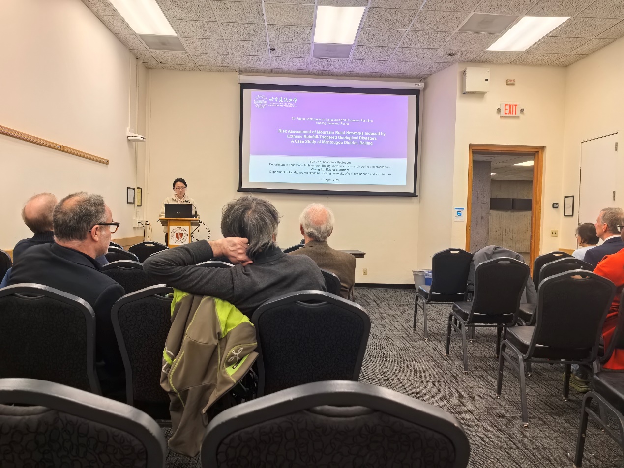 会议共设7个分论坛,在丁奇教授的指导下,田雨泽博士在“Urban and Community Parks”分论坛进行了口头报告,报告题目为“Research on the Evaluation andStrategy of Streets in the Central UrbanDistricts of Beijing from the Perspective of the Healthy Streets”,聚焦于北京中心地区城市街道的健康影响评估,量化分析街道问题并探讨成因与策略。研究采用改良后的伦敦健康街道方法,对各类街道进行调研和评分,比较不同行政区街道的得分差异及其原因。研究总结了北京街道在基础功能和休闲体验方面的优势与不足,并从政策导向和综合治理层面分析街道问题的深层次成因,提出相应的更新措施,为其他大型城市街道健康评估研究提供参考。在孙喆副教授指导下,研究生郑璐在“Ecological and Environmental Design”分论坛做题为‘Risk Assessment of Mountain Road Networks Induced by Extreme Rainfall-Triggered Geological DisastersA Case Study of Mentougou District, Beijing’的报告。聚焦于极端降雨引发的地质灾害对北京市门头沟区山区道路网络的风险性评估,采用随机森林模型、复杂网络理论和熵权TOPSIS法,评估道路的危险性、脆弱性和暴露度。通过综合评估,研究为灾害应急响应、路网优化和地质灾害防治提供了科学依据。两位同学顺利完成报告发言并回答现场提问,与各国参会人员进行了深入的学术交流与讨论。